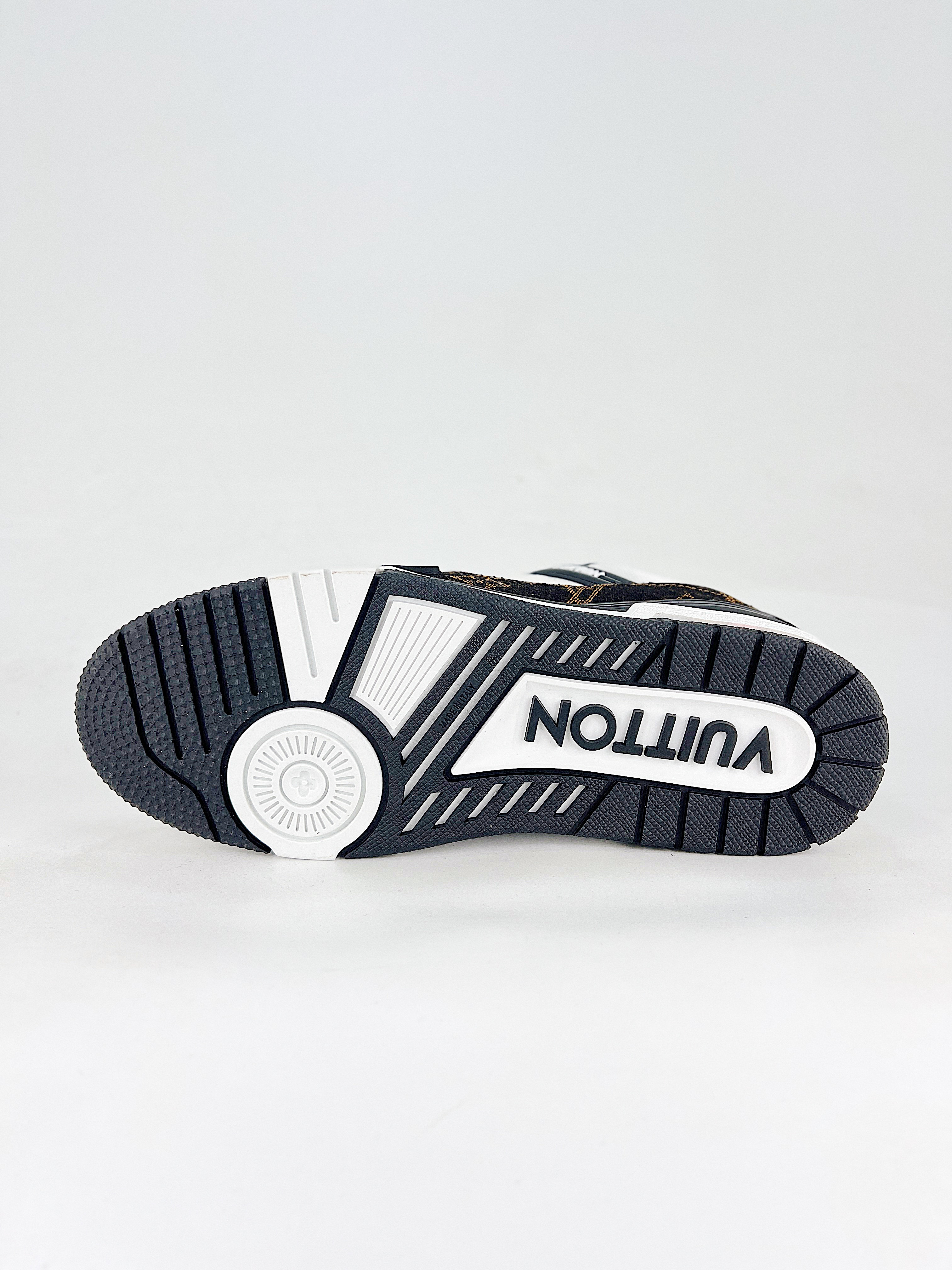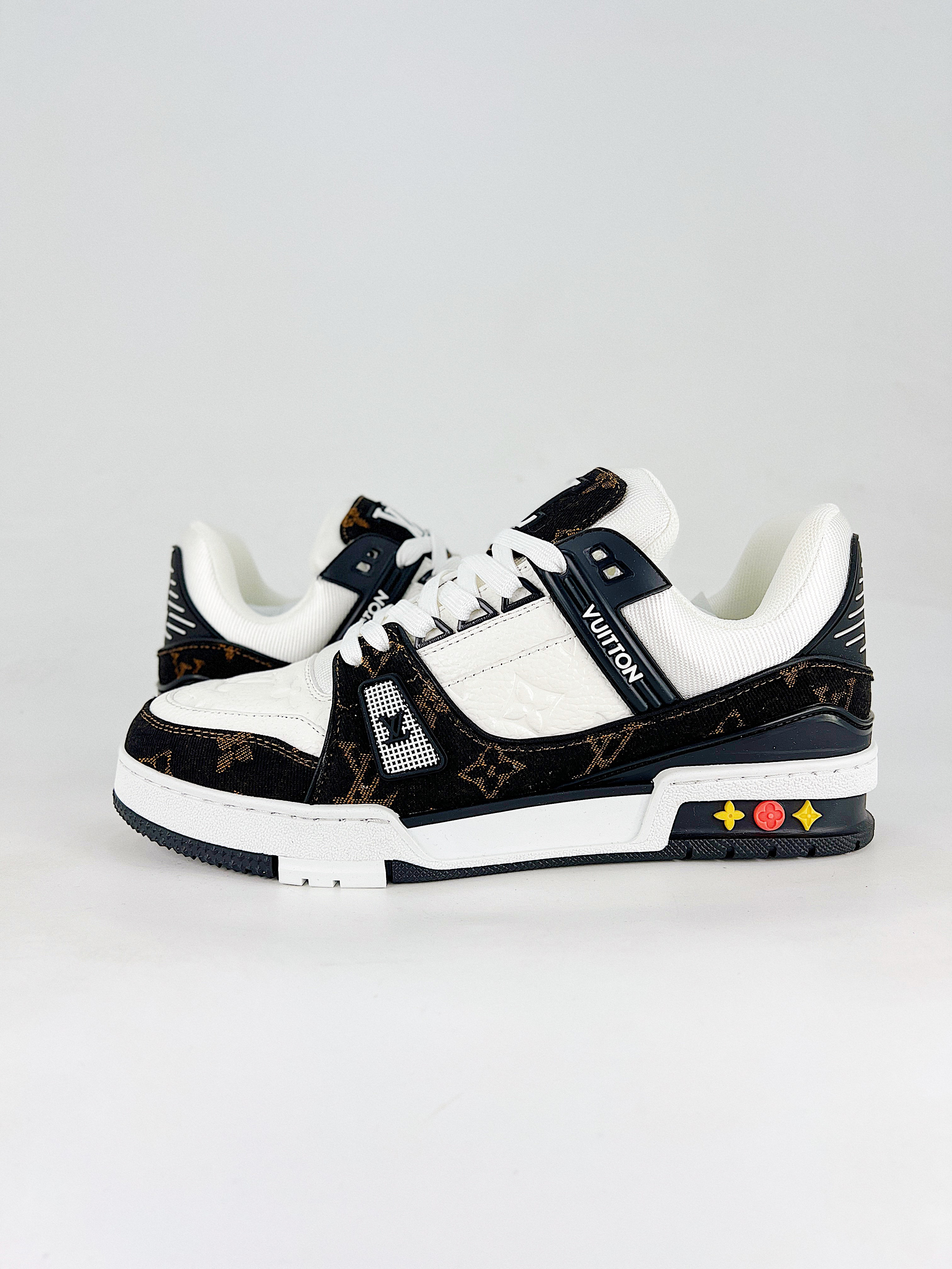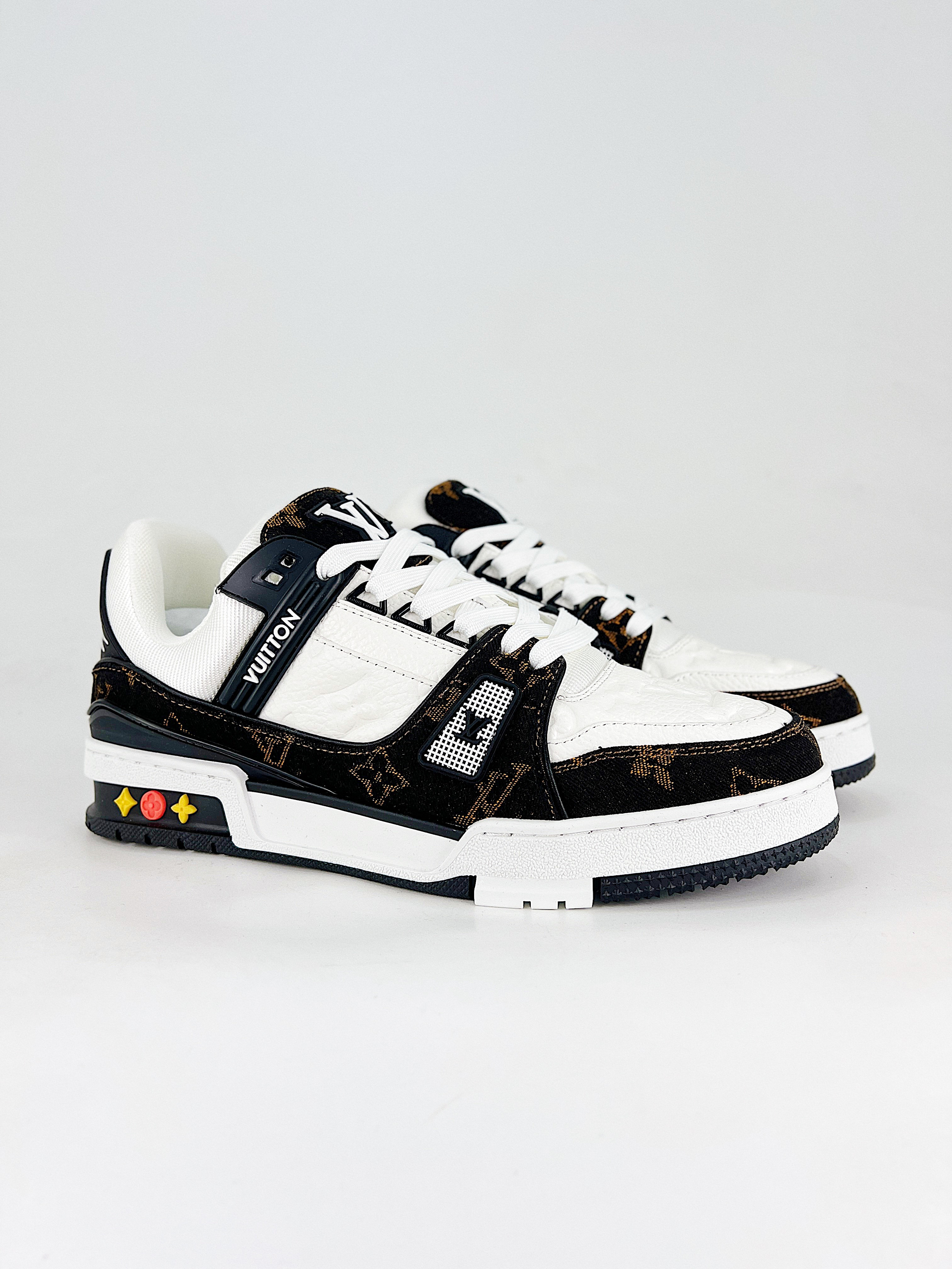 这款LV Trainer板鞋采用经典老花帆布搭配压纹牛皮革拼接设计,带有品牌标志性VUITTON饰条和Monogram印花,厚底造型兼具轻奢质感与潮流穿搭属性,适配日常出街、休闲通勤等场景,属于高端奢品休闲鞋款。