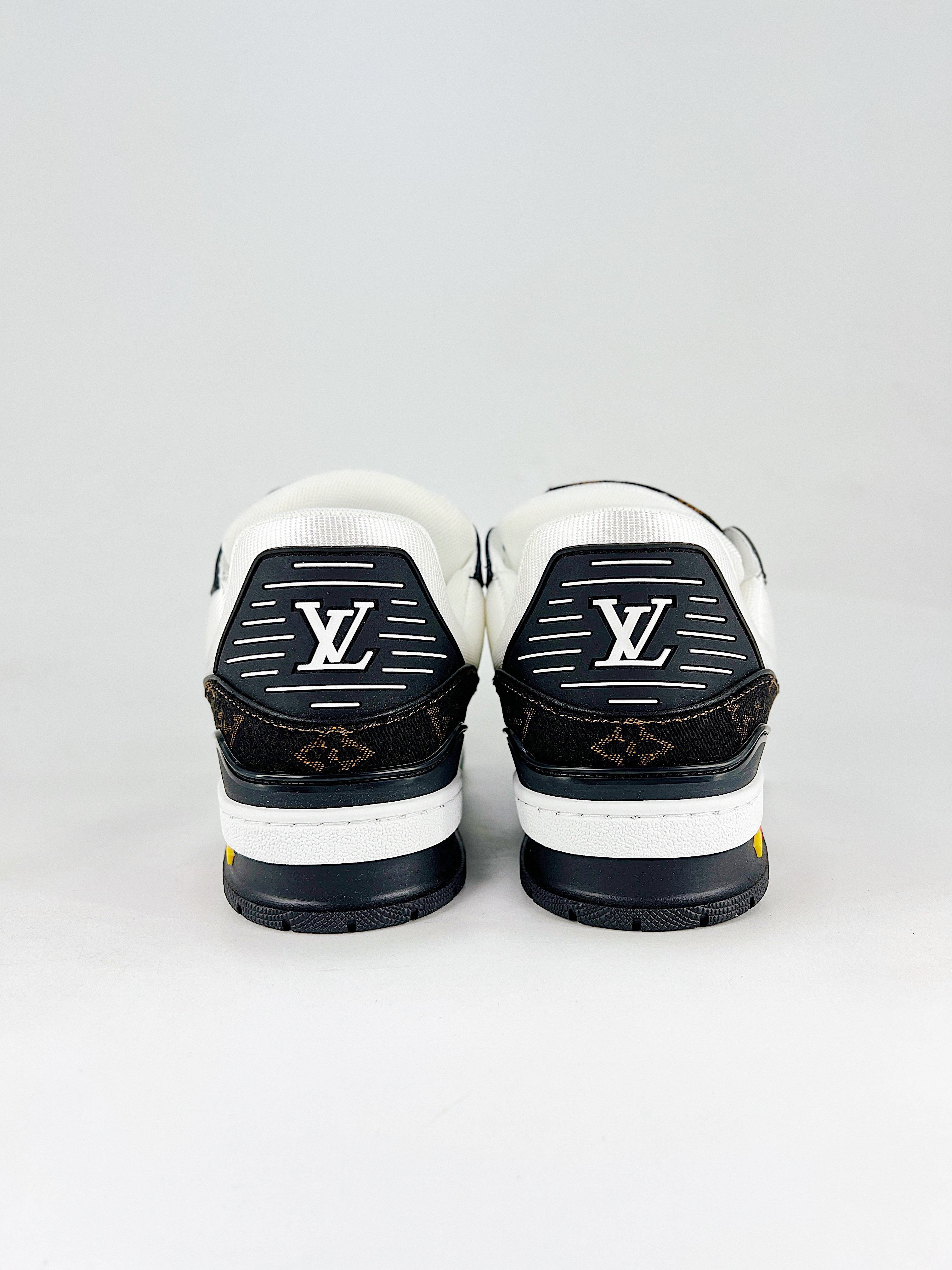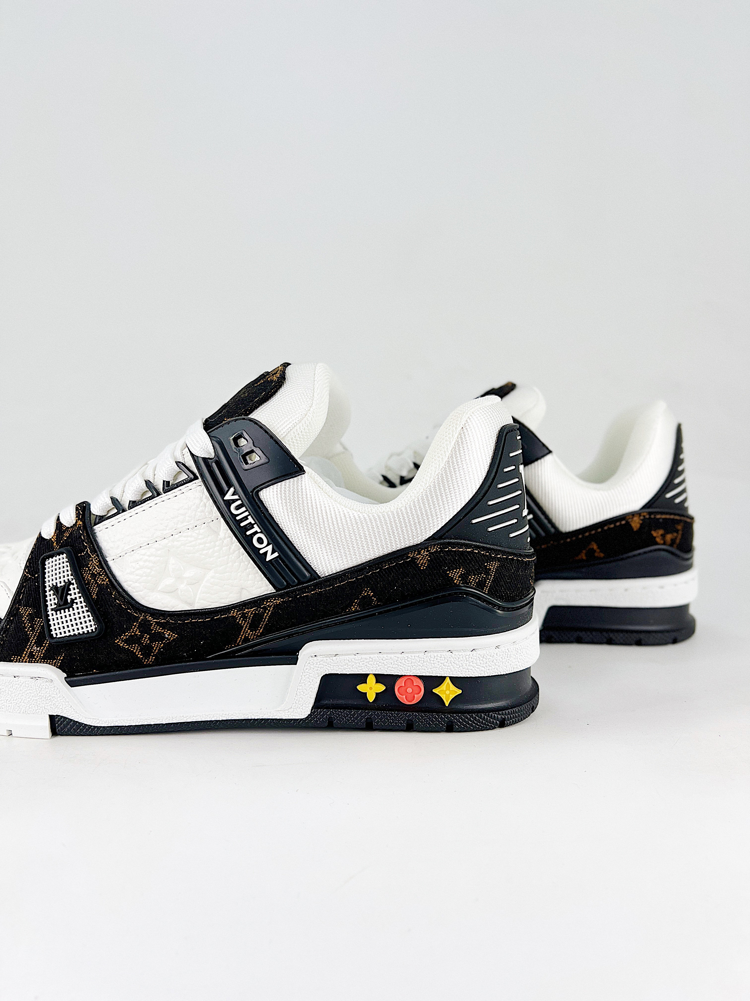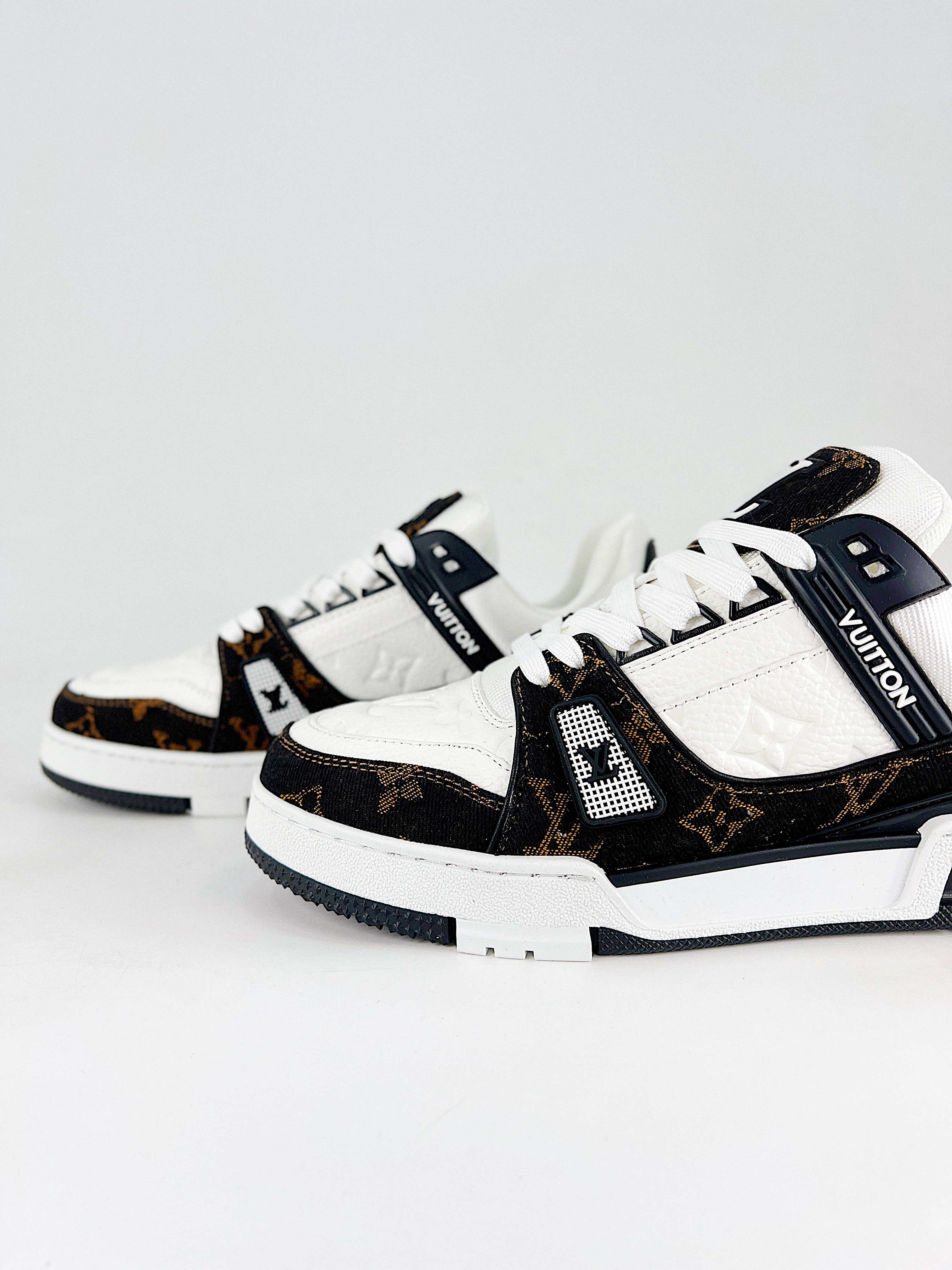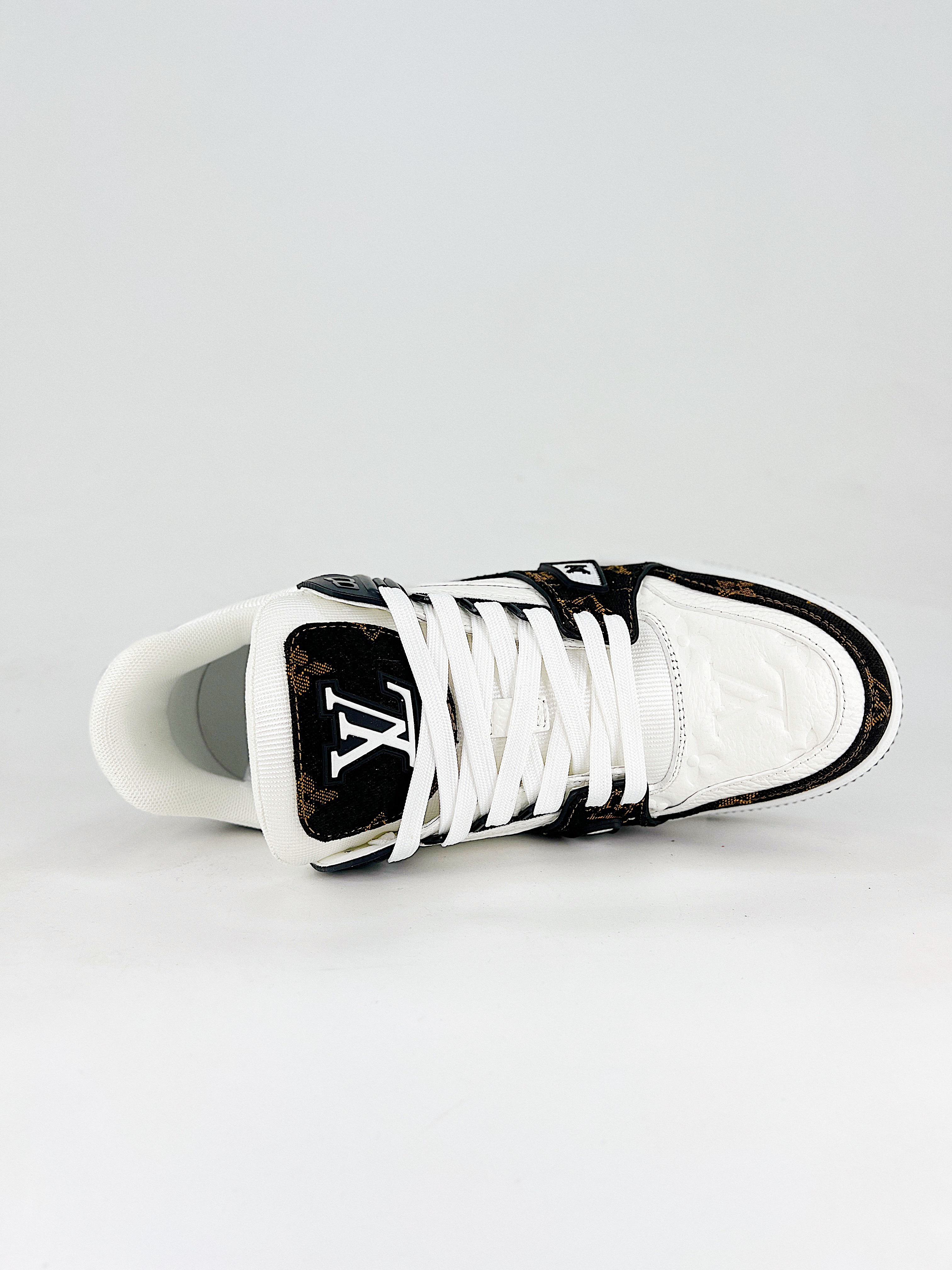 这款LV Trainer板鞋采用经典老花帆布搭配压纹牛皮革拼接设计,带有品牌标志性VUITTON饰条和Monogram印花,厚底造型兼具轻奢质感与潮流穿搭属性,适配日常出街、休闲通勤等场景,属于高端奢品休闲鞋款。