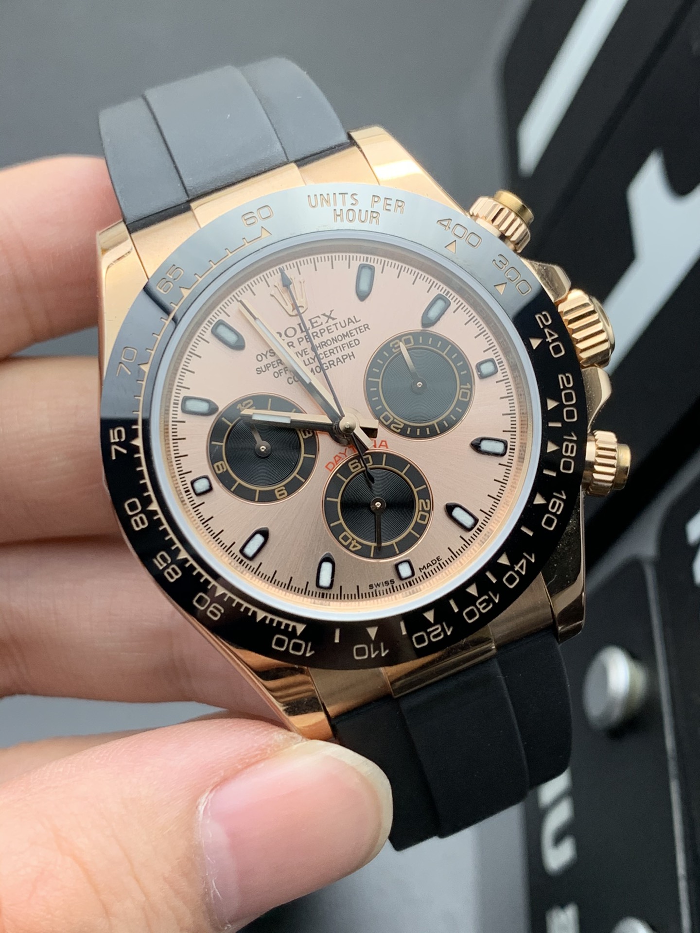劳力士宇宙计型迪通拿玫瑰金粉盘黑胶带计时腕表
